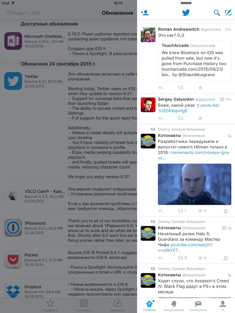 Кроме того, компания не ударилась в оголтелый техно-фанатизм и не проводила эксперименты с использованием двух приложений одновременно на iPhone, в то время как Samsung считает такую «фичу» вполне конкурентным преимуществом новых S6 Edge+. Благодаря новой iOS мы наконец увидели, что iPad — это не iPhone-переросток и не растянутый в несколько раз iPod Touch.