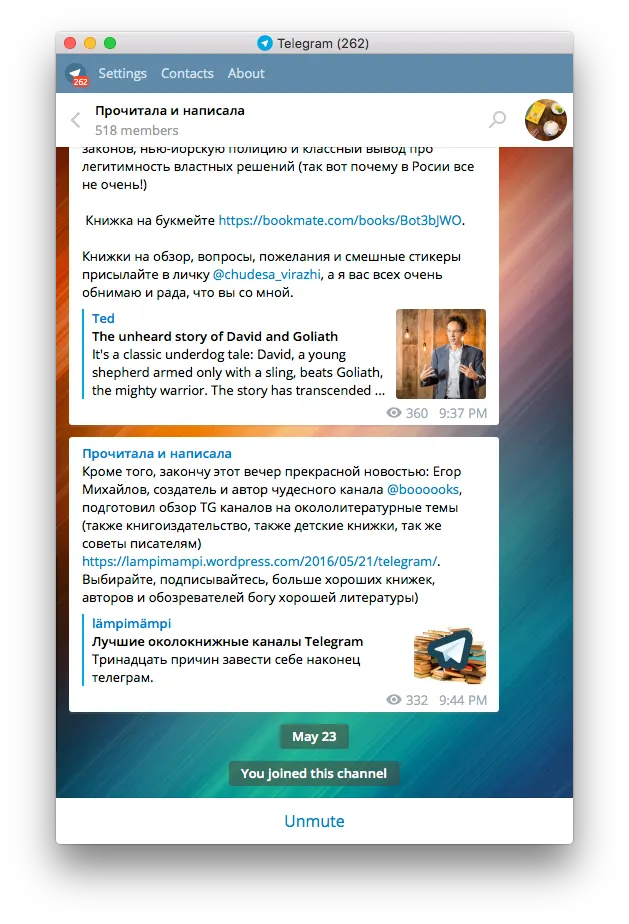 Прочитала и написала — очень честный канал. Автор не придумывает глупых и елейных оборотов для описания никому не интересных книг. Много нон-фикшна, нормальный юмор и хорошие книжки.