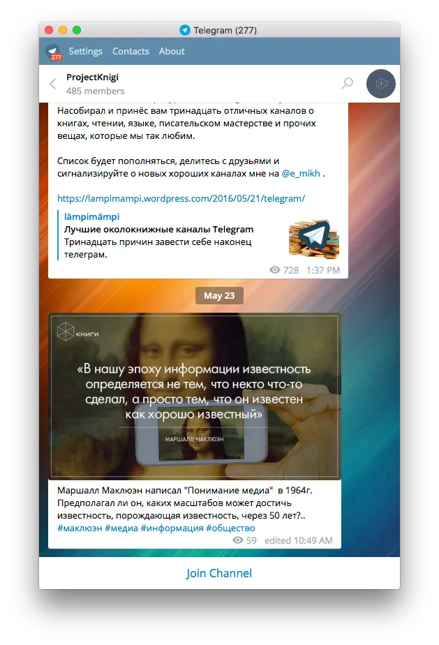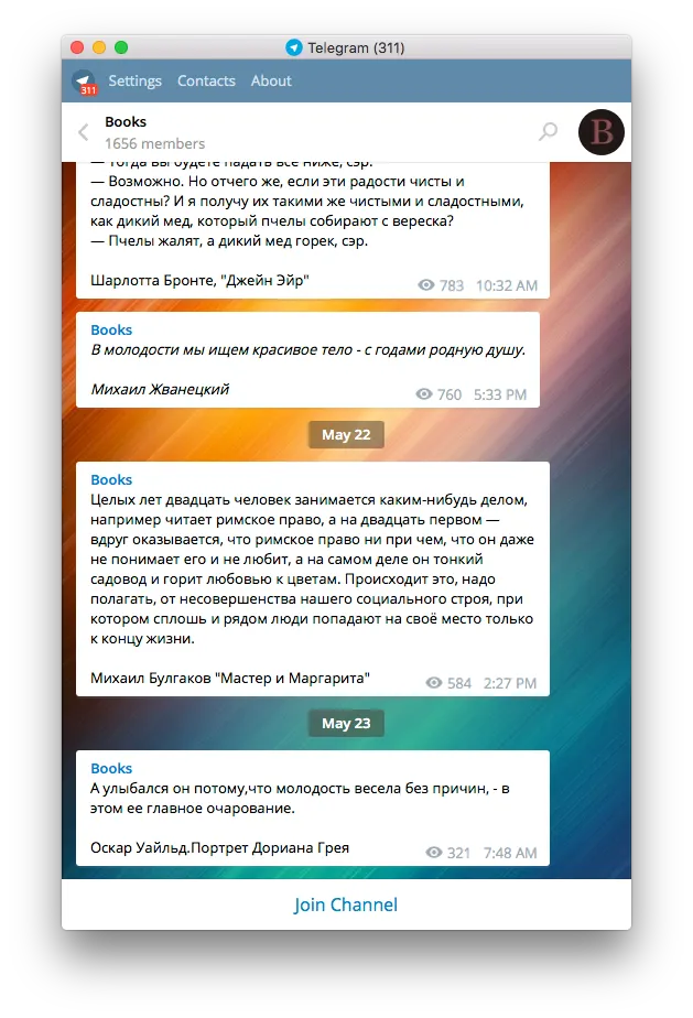 Books — глупо оформленный канал, который подойдет любителям цитат. Терпеть не могу подобную манеру, но поскольку в канале более полутора тысяч человек, это еще раз подсказывает, что чтение — не панацея от идиотизма.