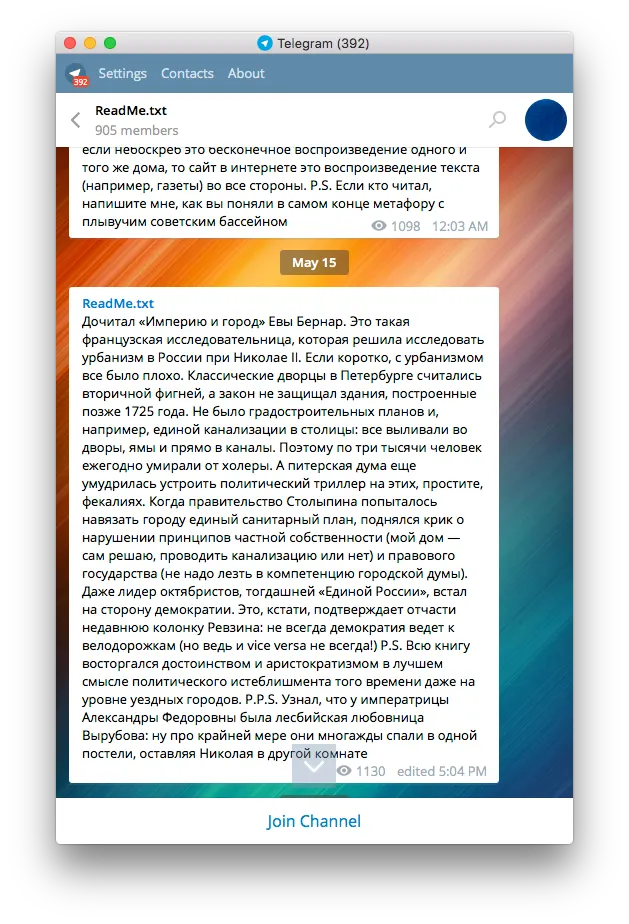 Readme.txt — канал Ильи Клишина, куда он неспешно и скромно (в плане объема) записывает впечатления от прочитанного. Новинок нет, но хорошие названия попадаются.