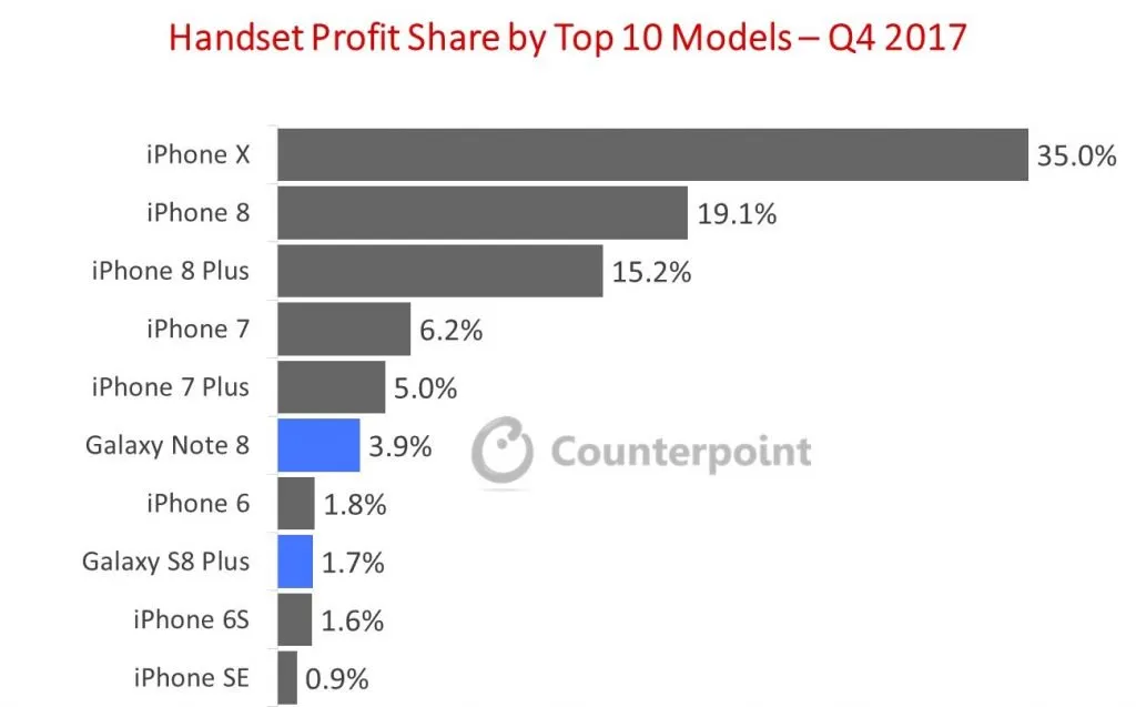 Аналитики из Counterpoint изучили рынок мобилок за четвертый квартал 2017 года и вытащили поразительную статистику.