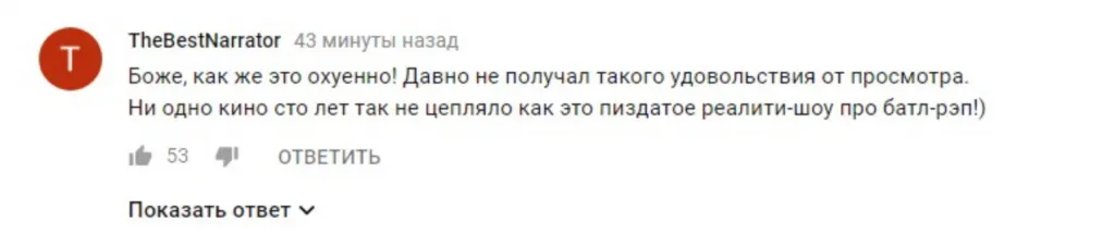 Но этого коня ему уже не обуздать. Толпа идею оценила. Толпа вообще любит тупые реалити – вспомните рейтинге пикового «Дома-2» и «Каникул в Мексике». Именно поэтому формат почти что беспроигрышный. Даже если его делают криво и без грамотных сценаристов, успех всё равно обеспечен, как мы видим. Оказалось, что людям плевать на батлы. Им нужно шоу, пусть и настолько низкопробное. Мне откровенно жаль чуваков из комментариев, которым это интереснее, чем любой фильм.