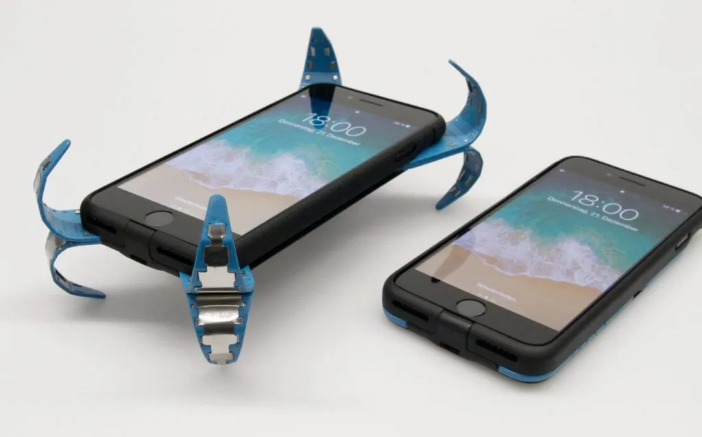 Кейс имеет специальные подпружиненные ножки, которые вылетают, когда аппарат находится в свободном падении. За это отвечает особый сенсор, срабатывающий как подушка безопасности.