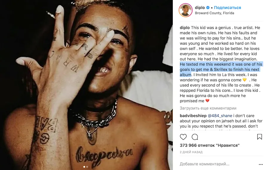 Буквально за пару дней до убийства, XXXTentacion общался с его другом, продюсером Diplo, и просил помочь закончить альбом. «Он написал, что одна из его целей – чтобы я и Skrillex закончили альбом». Диджей рассказал, что пригласил артиста в Лос-Анджелес на неделе. Онфрой не успел приехать.