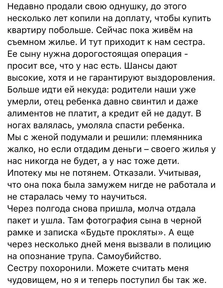 Вероятно, это фейк или баян (хотя я не видел), но суть не в оригинальности контента, а в том, насколько суровый выбор. В принципе, внутри поста достаточно информации для того, чтобы принять решение. Как бы поступили вы?