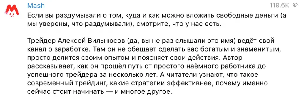 Mash – один из самых уважаемых мною телеграм-каналов. Быстро, иронично, классно – искренне их люблю. Но и там недавно вышла реклама трейдера Алексея Вильнюсова.