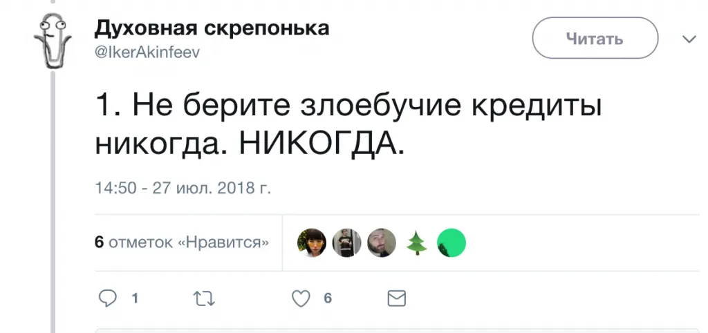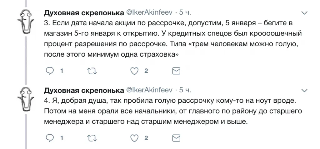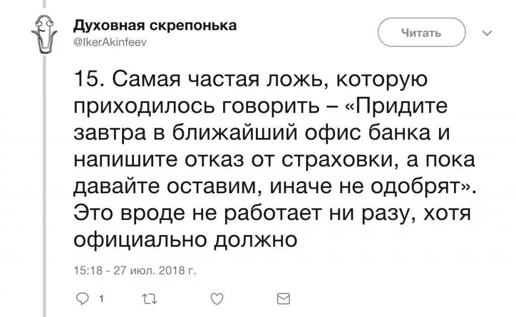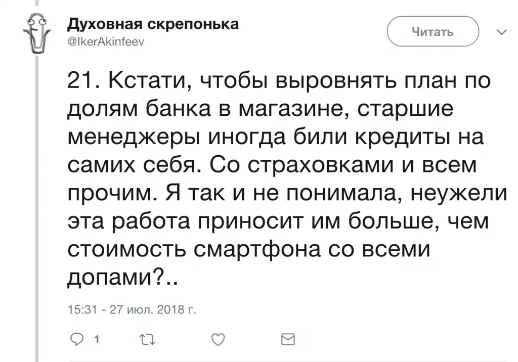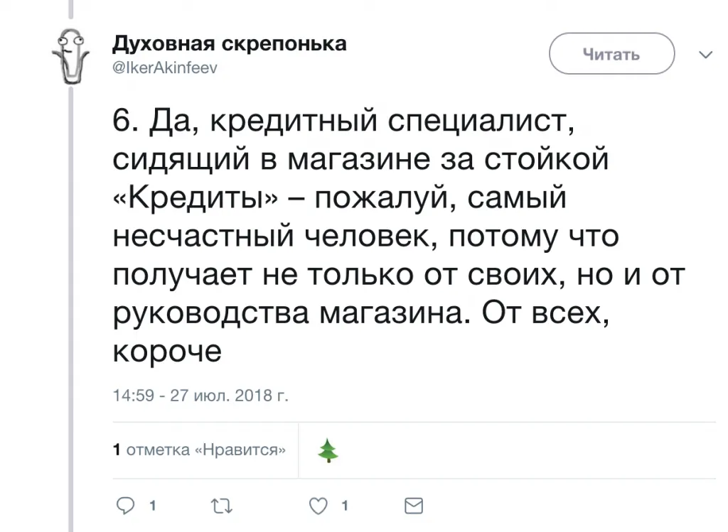 Бывшая сотрудница кредитного отдела «Духовная скрепонька» четыре месяца выдавала деньги на всякую электронику людям, лучшие друзья которых – коллекторы и судебные приставы. И собрала несколько важнейших фактов о потребительских кредитах.