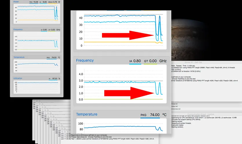 При суровой загрузке (рендер видео, игры, разгон) температура чипа повышается до критической отметки уже на 2900 МГц. Соответственно, в дело включается троттлинг и понижает мощность процессора. В итоге модель 2017 года уделывает самый топовый и дорогой мак на рынке.