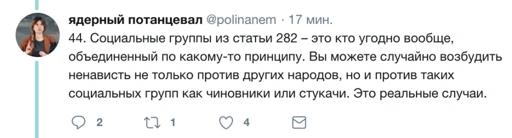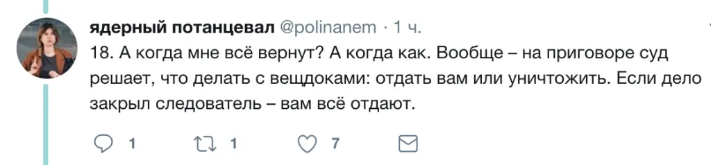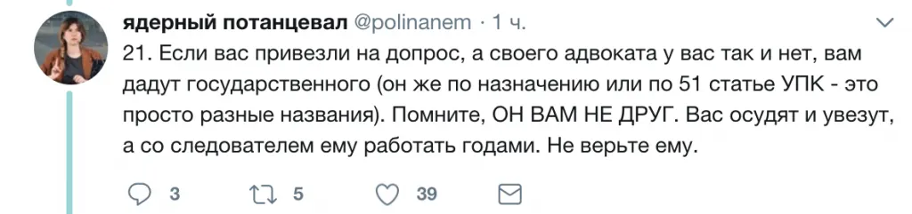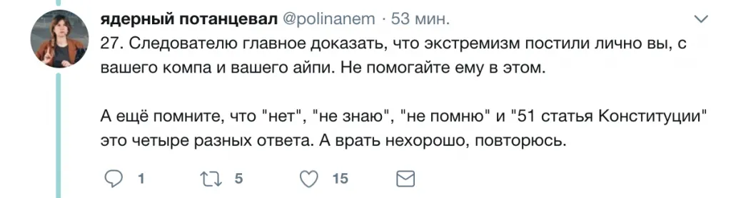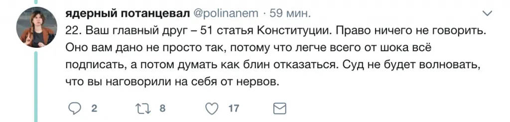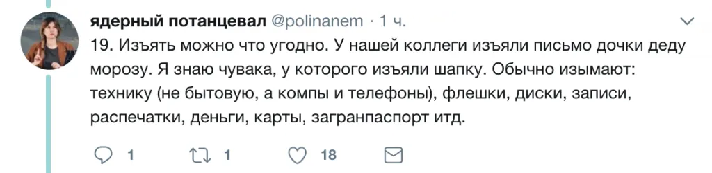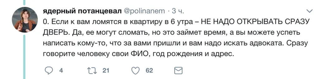 На фоне дикой истории активистка «Открытой России» Полина Немировская собрала в своем твиттере советы тем, к кому нагрянули с обыском. Ловите – как не сесть за репост, о чем разговаривать со следователями и что делать, если вашу дверь начали распиливать болгаркой.