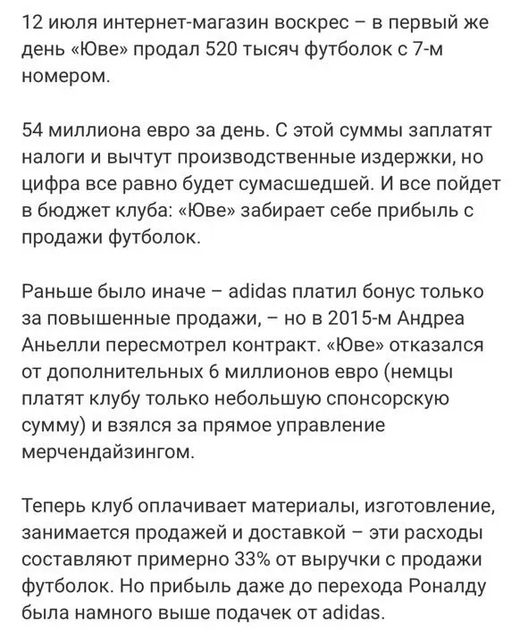 Выручку за все футболки, реализованные через свои точки, Юве забирает себе – в отличие от того, что было раньше, когда Адидас забирал все за 6 лямов. При этом, конечно, Адидас продолжает забирать всю выручку за футболки, реализованные через свои точки, а не магазины «Юве». Здесь описана структура этого контракта.