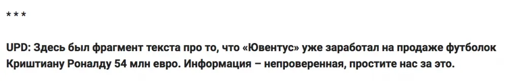 Важно в очередной раз прояснить муссирующееся заявление, что Ювентус отбил трансфер КриРо на футболках. В первую очередь важно понимать, что ни один клуб, располагающий обычным контрактом с техническим спонсором, никогда не отбивает трансфер на футболках.