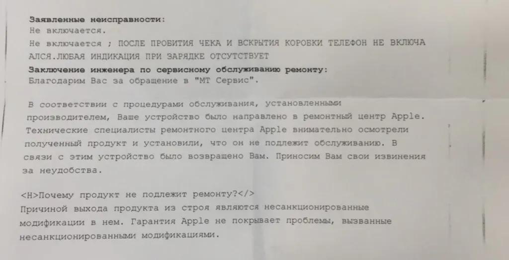 Июль, приходит SMS об окончании экспертизы. «Обратитесь в магазин» — сделано. По совпадению вместе с теми же сотрудниками трепетно читаем заключение: «Технические специалисты ремонтного центра Apple внимательно осмотрели полученный продукт и установили, что он не подлежит обслуживанию. В связи с этим устройство было возвращено Вам».
