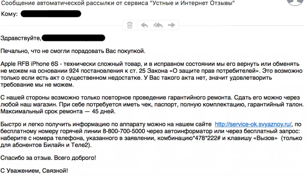И действительно, спустя два дня ответ пришел: «Печально, что не смогли порадовать Вас покупкой. Apple RFB iPhone 6S — технически сложный товар, и в исправном состоянии мы его вернуть или обменять не можем <…> Это возможно только если есть акт о существенном недостатке. У Вас такого акта нет, значит удовлетворить требование мы не можем». Всё, раскольцовочка, неработающий из коробки телефон – это «технически сложный товар в исправном состоянии». В итоге деньги – на счету у «Связного», айфон – на полке у «Связного».