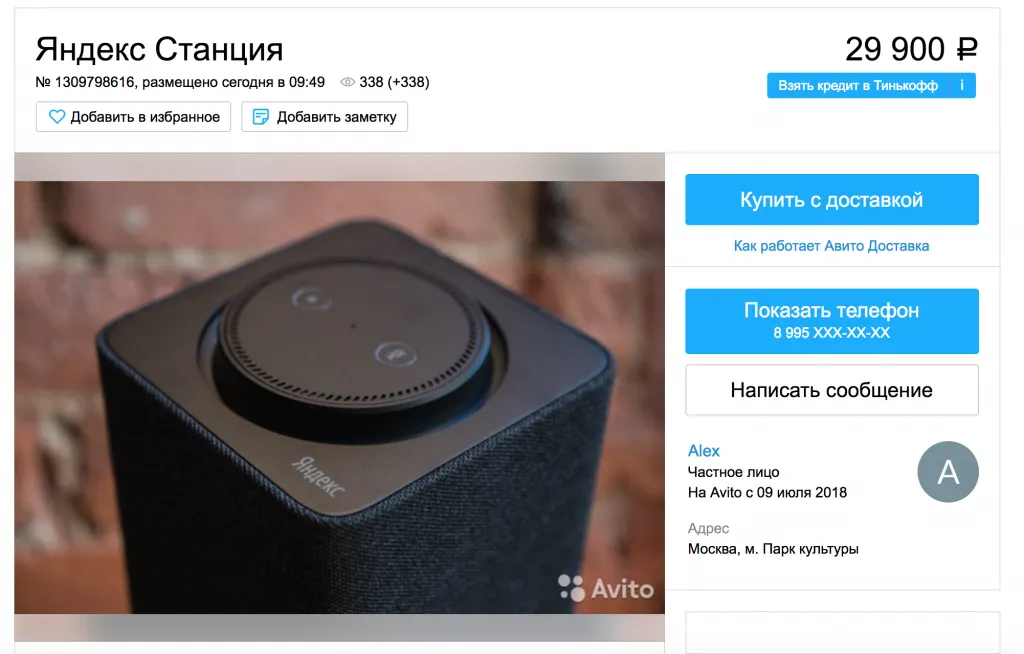 Синхронно с открытием продаж в интернете появились объявления. Из-за того, что «Яндекс.Станцию» давали лишь по паре в одни руки (а в онлайне колонки до сих пор нет), цена на вторичном рынке заметно увеличилась.