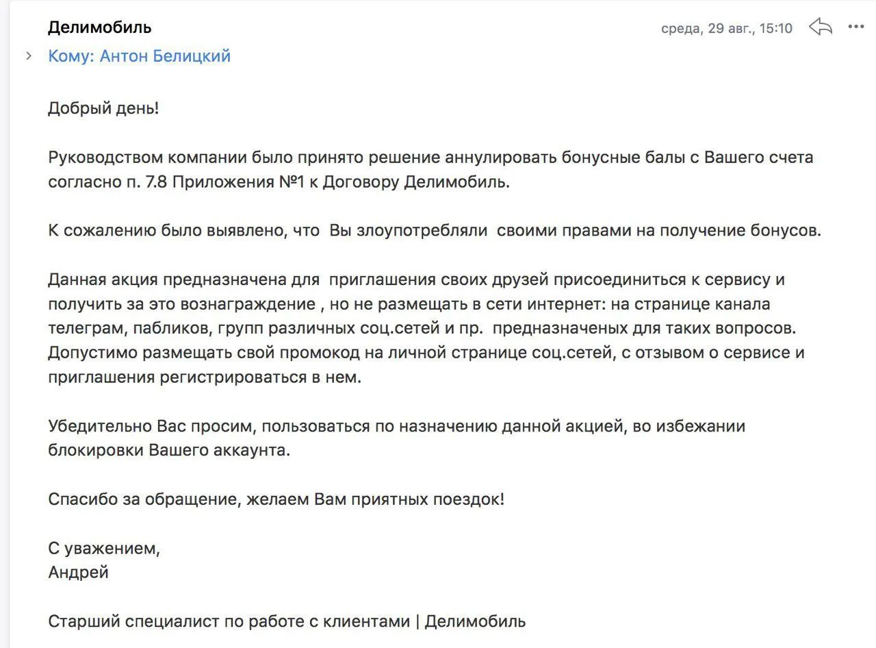 В ответ на возмущение блогера «Делимобиль» заявил, что Антон распространял промокод «среди неопределенного круга лиц» (то есть среди своих подписчиков). Пока шло разбирательство, по промокоду Белицкого на счет капнуло еще 1500 рублей, который хитрый сервис тоже подрезал (!).