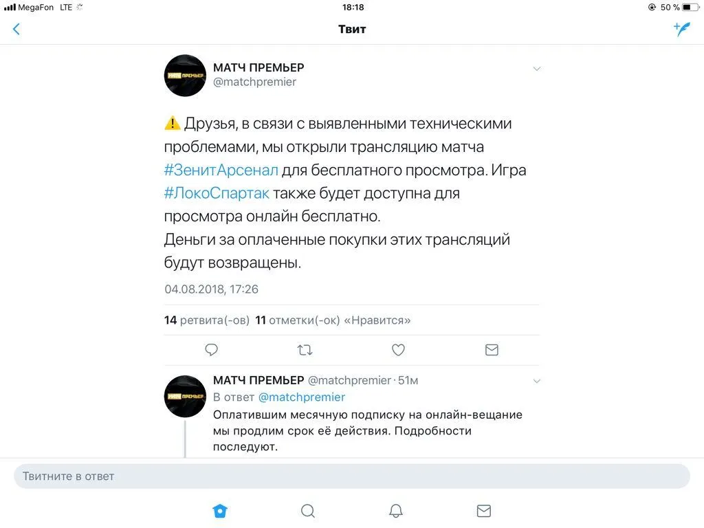 После этого «Матч премьер» все же выпустил серию оправдательных твитов: