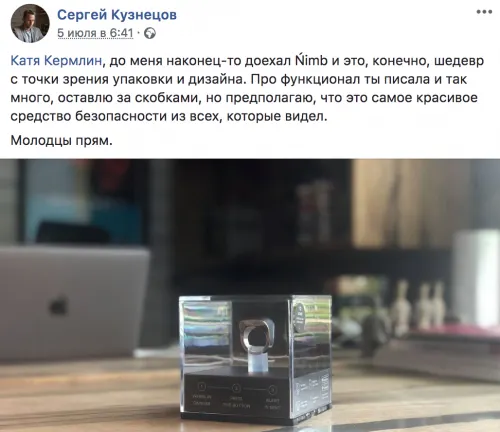Но Катя вспомнила личную трагедию не просто так. Кейс с девятью ножевыми был нужен для рекламы кольца Nimb. Девайс вывели на Кикстартер, дали ему прайс в 250 баксов, а работать он должен был так: подключаешь к смартфону и юзаешь в роли тревожной кнопки.