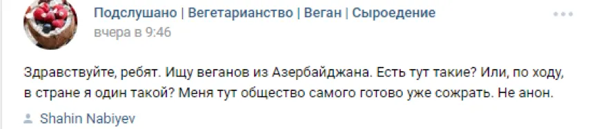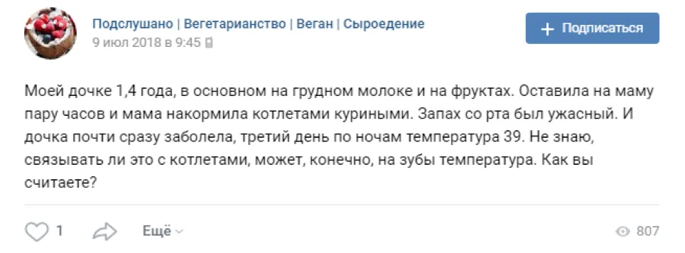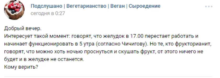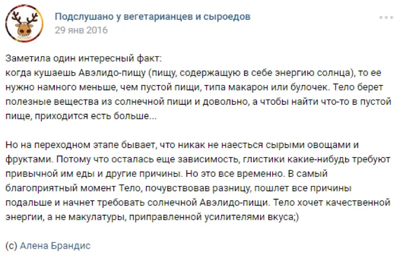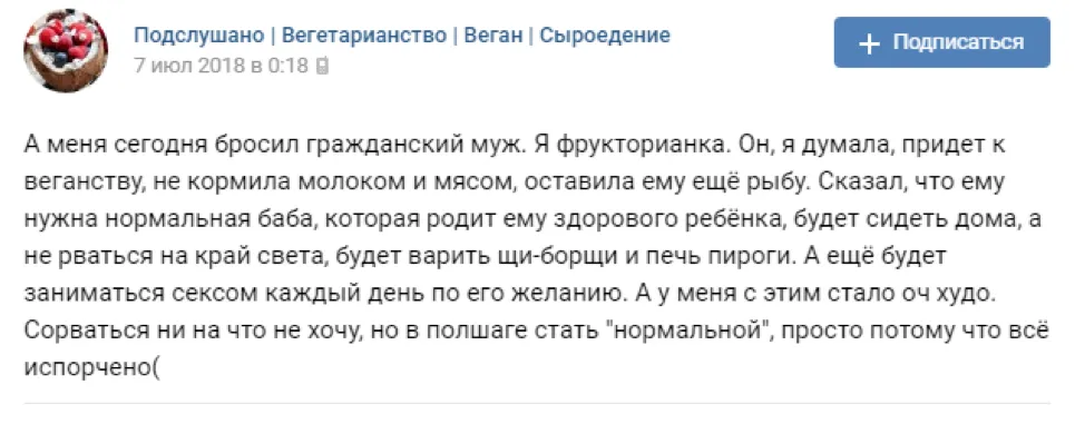 «Контакт» стал настоящим пристанищем веганов, сыроедов, фрукторианцев и прочих любителей самоутверждаться с помощью еды. Эти ребята отличаются настойчивостью, навязчивостью и проблемами с элементарной логикой. Как-то раз моя жена нашла пост девушки-фрукторианки и кинула его мне, открыв портал в ад.