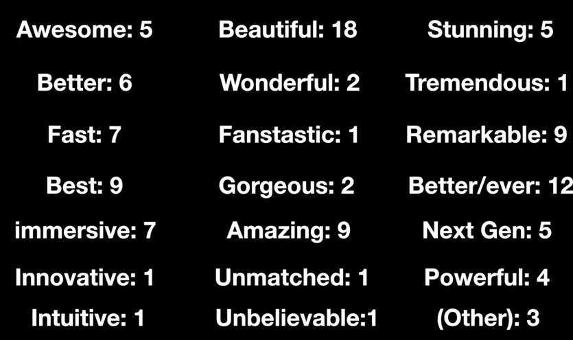 За восемь лет количество красивых слов увеличилось почти в четыре раза – на минувшем ивенте Тим Кук и компания произнесли 109 прилагательных.