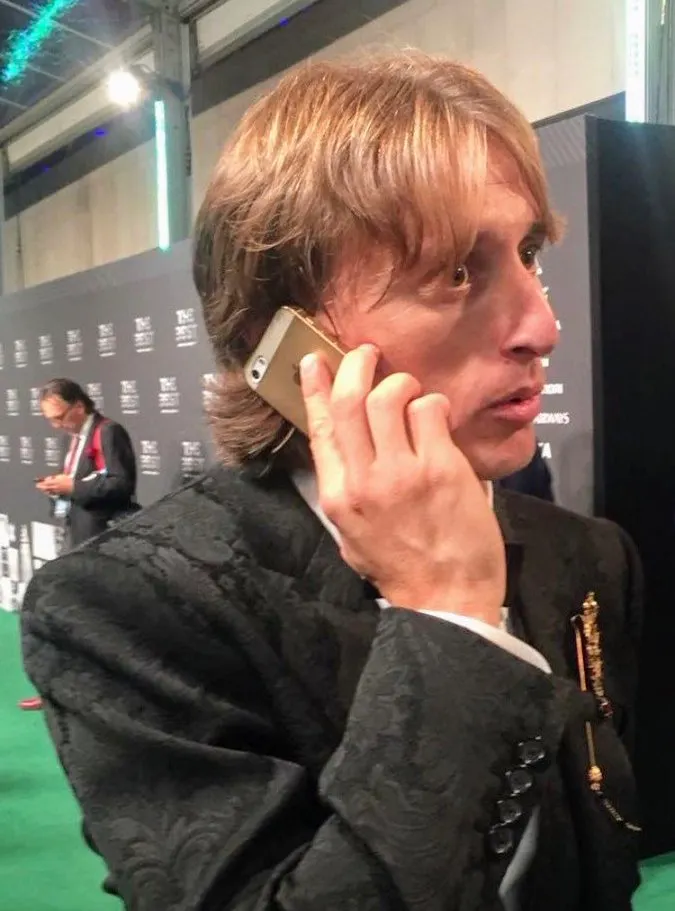 У хорватского гения в руке золотой iPhone SE или iPhone 5s (разобрать с такого ракурса сложно, но думаем, что это модель 2016 года). Обратите внимание, даже на фоне щуплого Модрича iPhone кажется миниатюрным, его простоту подчеркивает потертый пожелтевший чехол, словно купленный на AliExpress за 23 рубля.