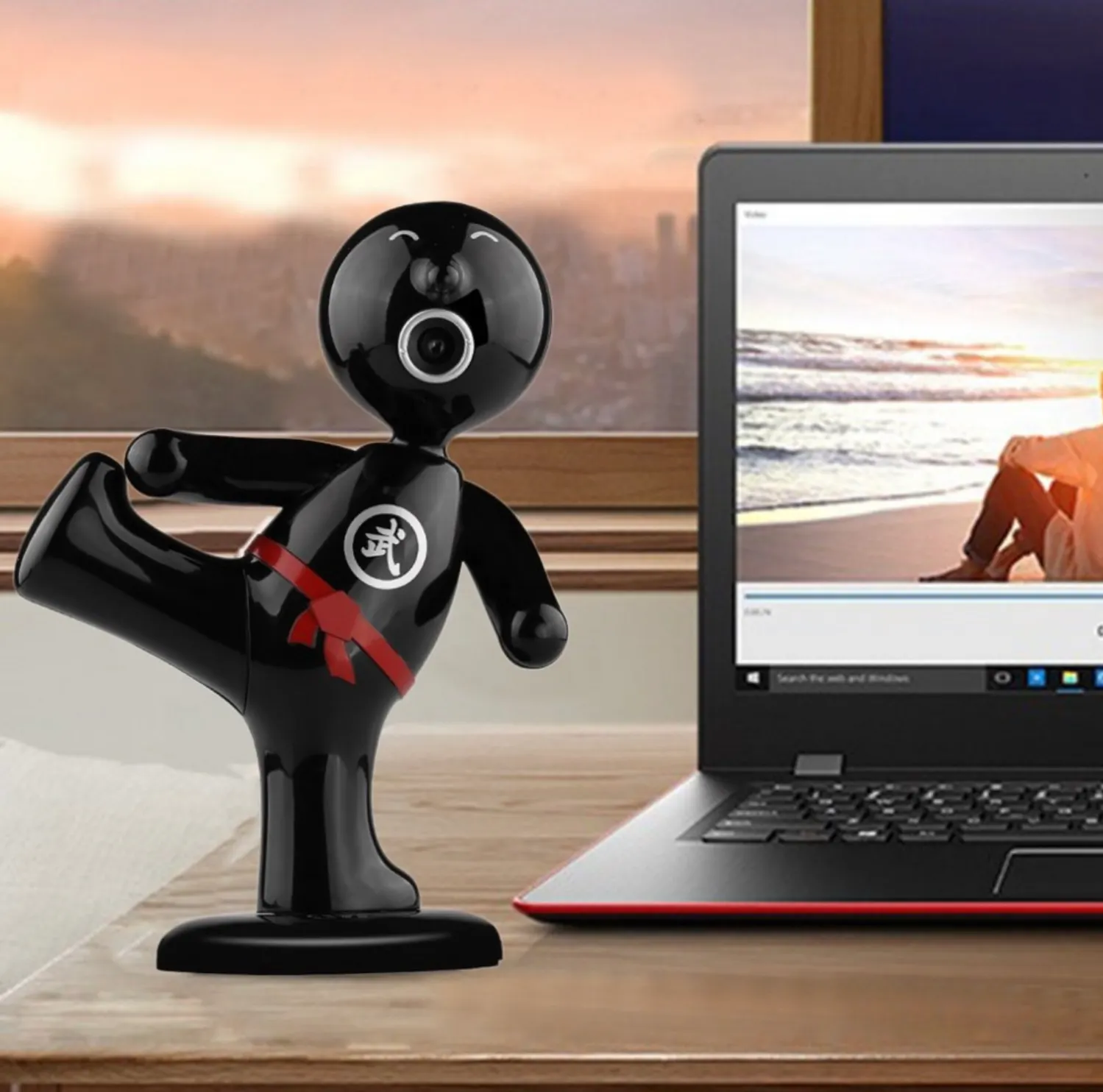 18-сантиметровая статуэтка каратиста с сенсором обратной подсветки для уютных вечеров с бабушкой в Скайпе. Молодой человек самостоятелен — не в пример вебкам на хлипких прищепках. Не упадёт, не потеряется. Стоит себе и стоит на одной ноге. Почему бы и нет.