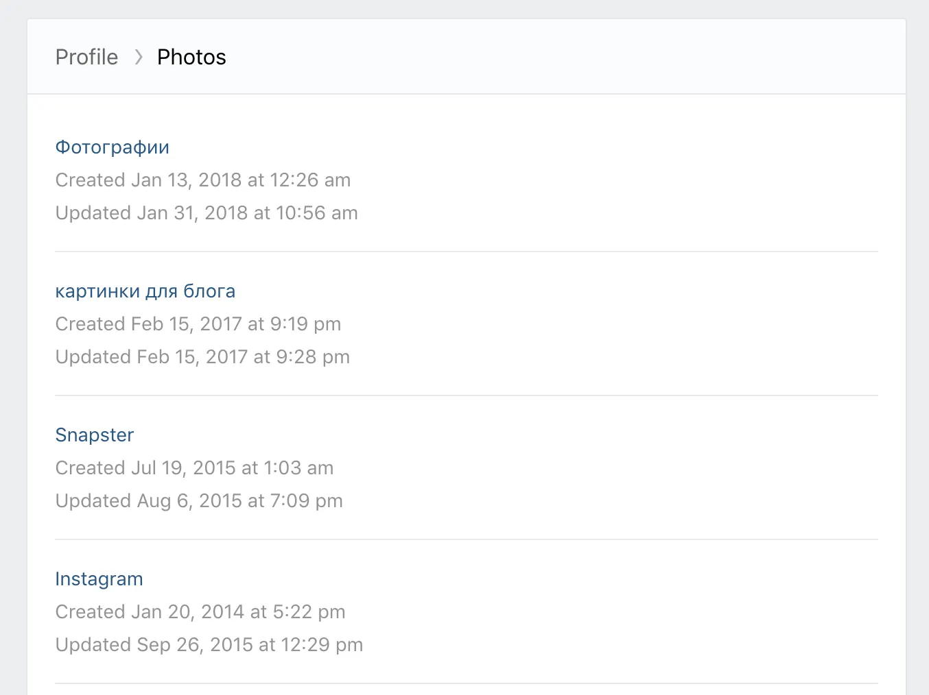 В архив загружены пережатые фотографии профиля, картинки, отметки друзей, все снимки из альбомов. Тут ничего интересного: удаленных фотографий нет, только видные всем и только мне пикчи.