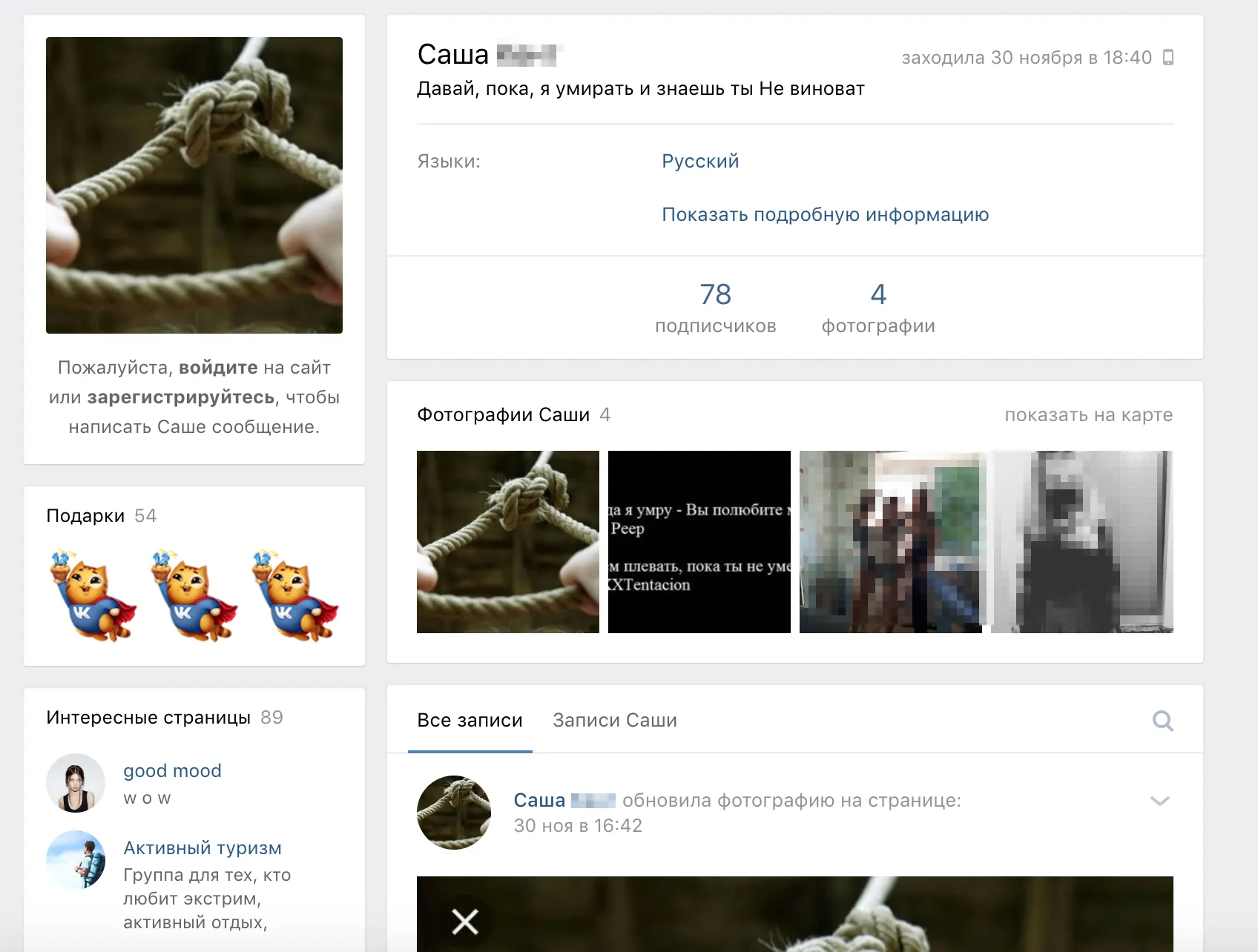 Во-первых, на аватарке Саши – петля. Плюс картинка с суицидальными цитатами умерших рэперов – Lil Peep и XXXTentacion (последняя – от 17 октября).