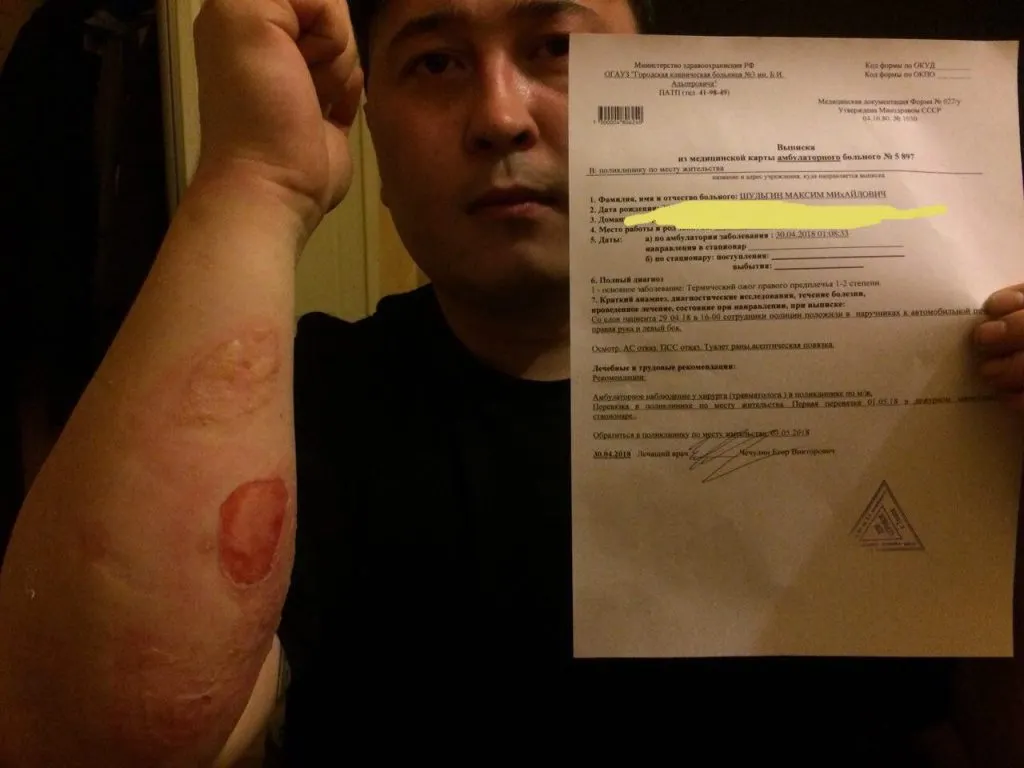 29 апреля Шульгина схватили и положили на пол машины рядом со включенной автомобильной печкой. Максим получил ожоги рук. В сентябре томский СК отказал в возбуждении уголовки о пытках.