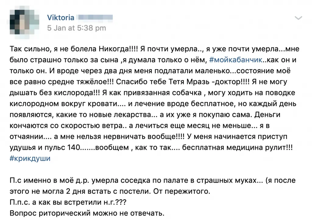 Женщина попала в больницу в конце декабря. Диагноз – воспаление легких или пневмония. Новый год молодая мать встретила в больнице, весь период тщетного лечения она фиксировала на своей странице VK в формате дневника. И писала в постах, что держится за жизнь ради маленького сына.
