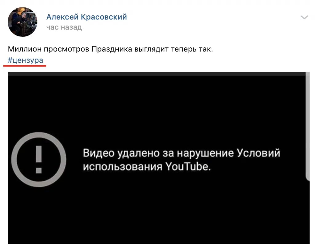«Миллион просмотров на ютубе теперь выглядит так», – прокомментировал удаление режиссер Красовский. Алексей перезалил фильм в VK, судя по всему, мужчина будет оспаривать блокировку.