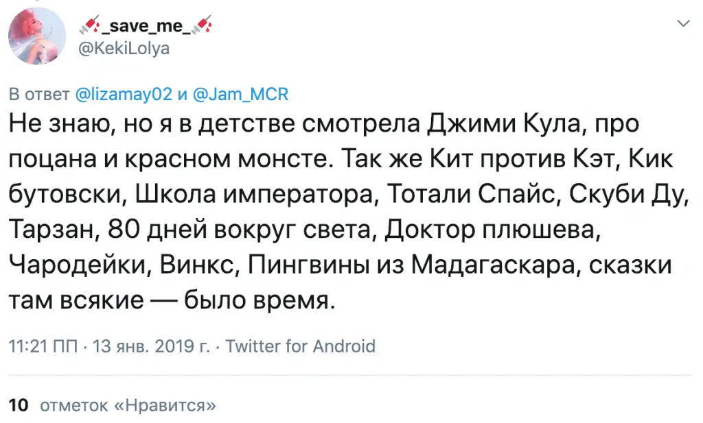 Вчера пользователь Twitter под ником @lizamay02 предложил порефлексировать и проверить свой возраст по мультикам и программам из нулевых годов. Предложение легло на благодатную почву – юзер набрал 2,5 тысяч ретвитов, 10,6 тысяч отметок «нравится» и запустил мем.