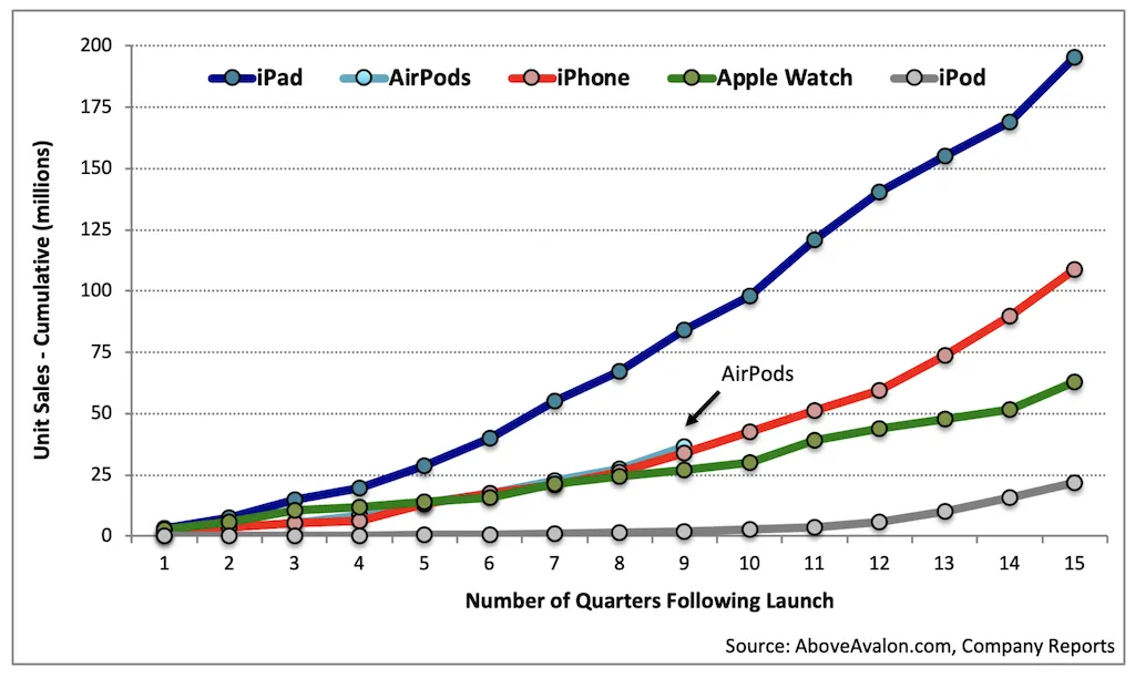 AirPods показывают хорошую динамику спустя девять кварталов после старта продаж, число реализованных девайсов превышает 25 млн штук. Спустя такое же количество времени лидер топа, iPad, разошелся тиражом более 80 млн экземпляров.