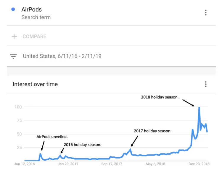 Беспроводные наушники интересны всем (особенно, в США). Так, на местном рынке в 2017 году словосочетание «AirPods» забивали в Google на 100% больше, чем в 2016 году, а уже в 2018 году (новогодние праздники) – на 500% больше, чем в прошлом.