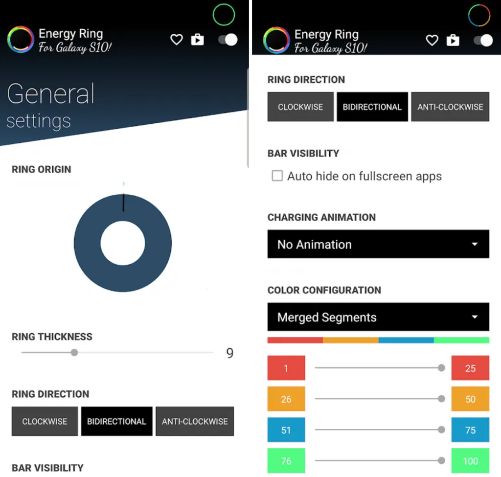 В Google Play появилось приложение Energy Ring, после установки которого вокруг фронталки появляется цветное кольцо. Его предназначение – показывать уровень зарядки аккумулятора. Например, когда устройство заряжено на 90-100%, кольцо горит зеленым цветом, на 60-80% – желтым, 40-50% – синим, и так далее.