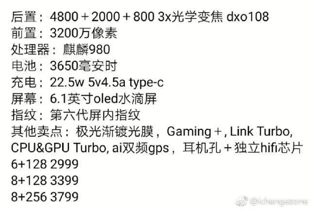 По остальным спекам. Модель выйдет с 6,1-дюймовым OLED-экраном разрешением 2340 х 1080 пикселей, последним чипом Kirin 980, фронтальной камерой на 32 мегапикселей, аккумулятором емкостью 3650 мАч с поддержкой быстрой зарядки на 22,5 Вт и NFC.