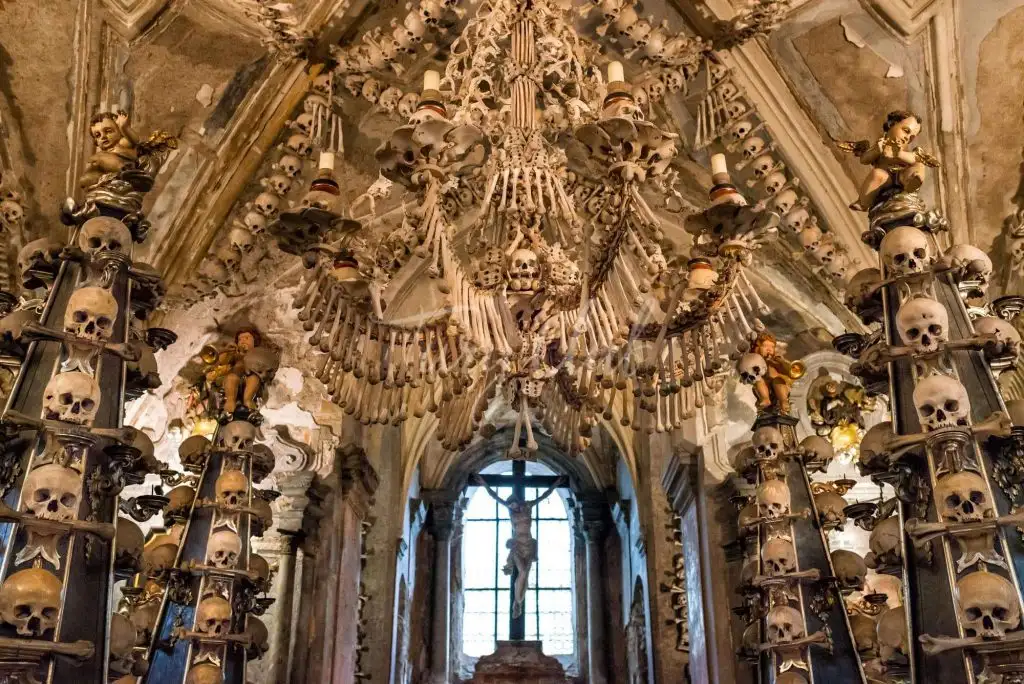 Внешний вид костёла, может быть, не так впечатляет, но вот интерьер уникален. Он полностью украшен настоящими человеческими костями из могил того самого кладбища. А мрачную композицию венчает красивейшая люстра, где, по слухам, представлена каждая из костей человеческого тела. Судя по всему, такое место точно всех переживёт. К тому же, кости горят не очень-то хорошо.