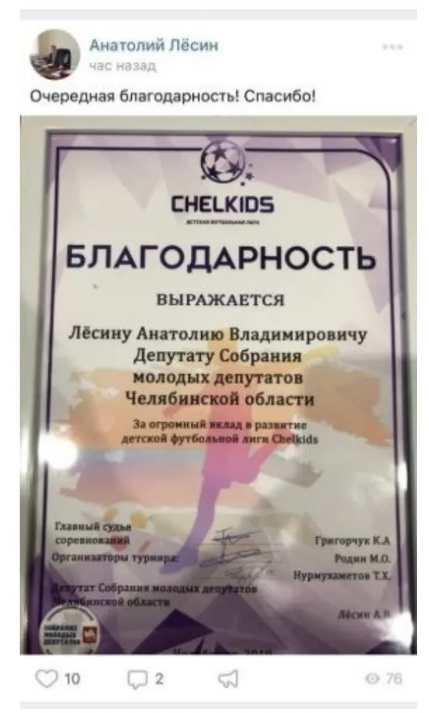 Челябинский депутат Анатолий Лесин запостил в соцсети фотографию грамоты за вклад в развитие детского спорта. Благодарность, как это часто бывает, народный избранник выписал сам себе.