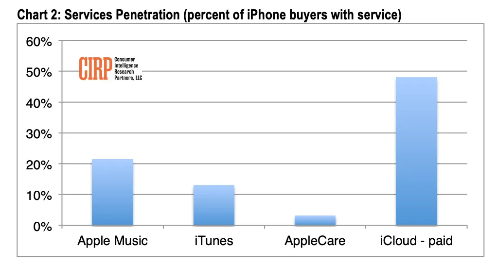 Apple Music пользуются чуть больше 20% владельцев айфонов, iTunes – в районе 10%, а за программу дополнительной гарантии Apple Care платят менее 5%.