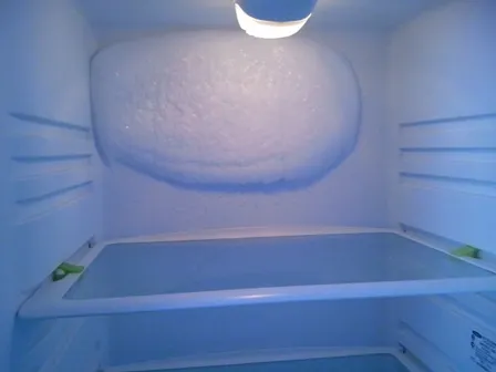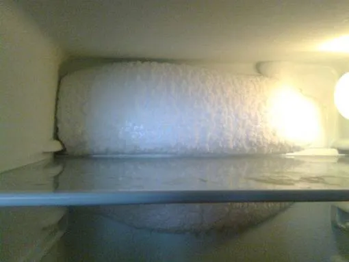 Судя по всему, мне очень повезло. Во-первых, прибор продолжал работать. Во-вторых, никакого пожара не случилось. Объясняю это тем, что зазор между створкой и проемом был минимальным, из-за чего температура внутри не успела дойти до критичного уровня. Однако все продукты в основной камере испортились (морозилка не пострадала), а на задней стенке образовался конденсат, который превратился в морозную «шубу».