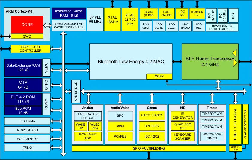Этот процессор отвечает вообще за все функции браслета: в него встроены и модуль Bluetooth, и контроллер питания, и даже отдельные элементы для шифрования с использованием современных алгоритмов. Вычислениями занимается единственное ядро Cortex M0, рядом с которым расположены 16 килобайт оперативной памяти.