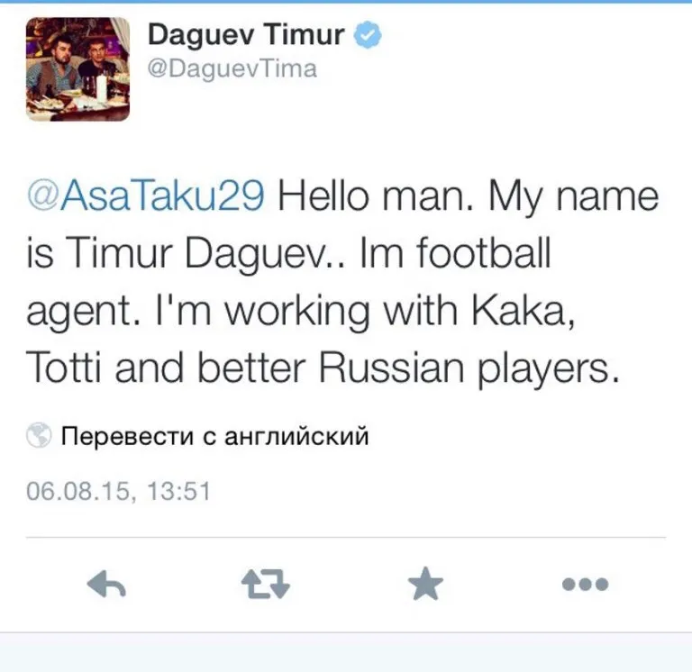 Несколько лет назад он нацелился на азиатский рынок и стал писать игрокам через твиттер. Например, формально принадлежащий «Арсеналу» форвард Такума Асано получил такое сообщение: «Привет, чувак. Меня зовут Тимур Дагуев. Я футбольный агент. Работаю с Кака, Тотти и лучшими российскими игроками». Спалившись перед кучей знакомых, Тимурка удалил реплай. Но интернет помнит все.