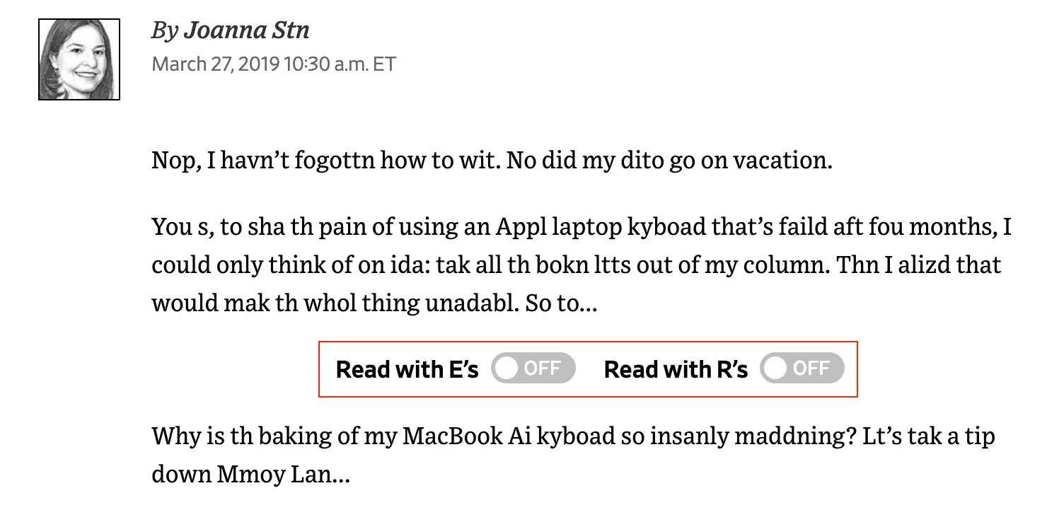 Лучше всего Apple казнила журналистка WSJ Джоанна Штерн, которая выпустила статью, набранную на поломанной клавиатуре MacBook. Почитайте, это весело.