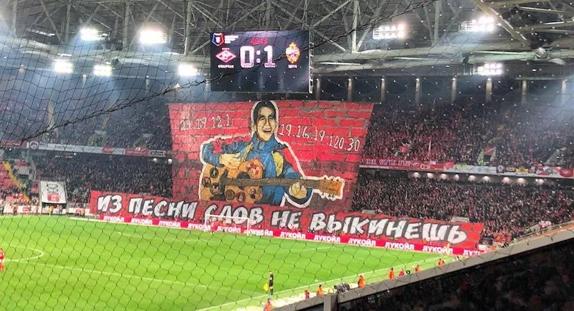 Болельщики «Спартака» вспомнили мем, перерисовали его на огромное полотно и добавили фразу «Из песни слов не выкинешь». Вероятно, чтобы к перфу не придралась полиция, кричалку зашифровали в виде цифрового обозначения букв в алфавите (Ц – 24, С – 19 и так далее).
