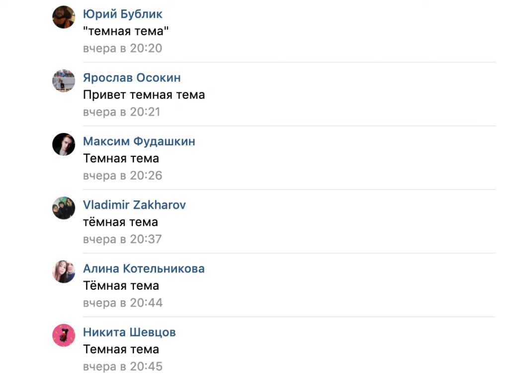 Пользователи VK поголовно пишут в комментариях словосочетание «темная тема», про нее шутят в твиттере, большинство не понимает, в чем дело. Тем временем пользователи «ВКонтакте» уже 1,5 млн раз запостили одинаковый коммент.