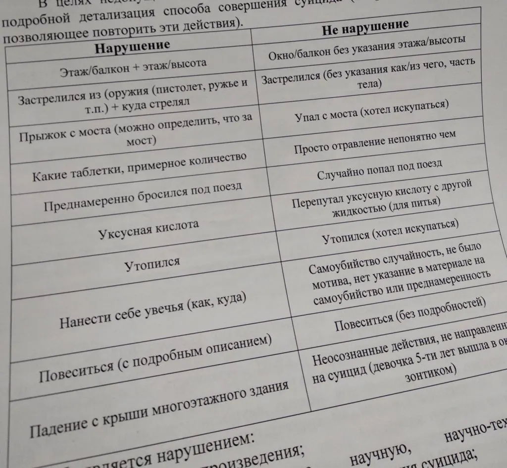 Кроме того, нельзя подавать материал так, чтобы из него показалось, что жертва убилась по своей воле. Например, «упал с крыши» писать нельзя, а «совершил неосознанные действия, не направленные на суицид» можно.