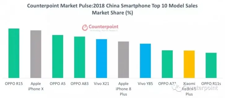 В Китае немного другая история. Самым продаваемым девайсом признали Oppo R15 – модель с 6,29-дюймовым AMOLED-экраном с вырезом, чипом MT6771 Helio P60, 4/6 Гбайт ОЗУ и 128 Гбайт встроенной памяти и батарейкой на 3450 мАч.