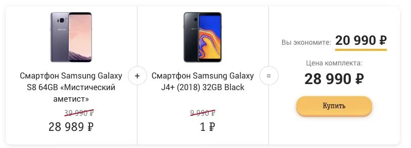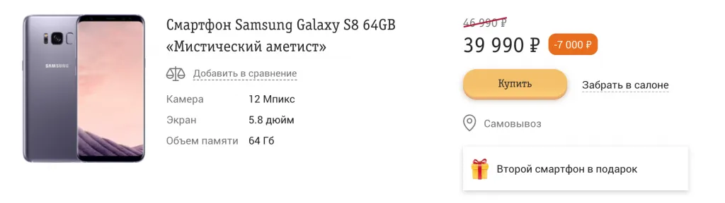 Galaxy S8 с 64 Гбайт памяти оценен в 39 990 рублей – это много, не спешите добавлять товар в корзину. На сайте «Билайна» нужно открыть раздел с аппаратами Samsung и выбрать Galaxy S8 (на лоте должен стоять бейдж «Второй смартфон в подарок»).