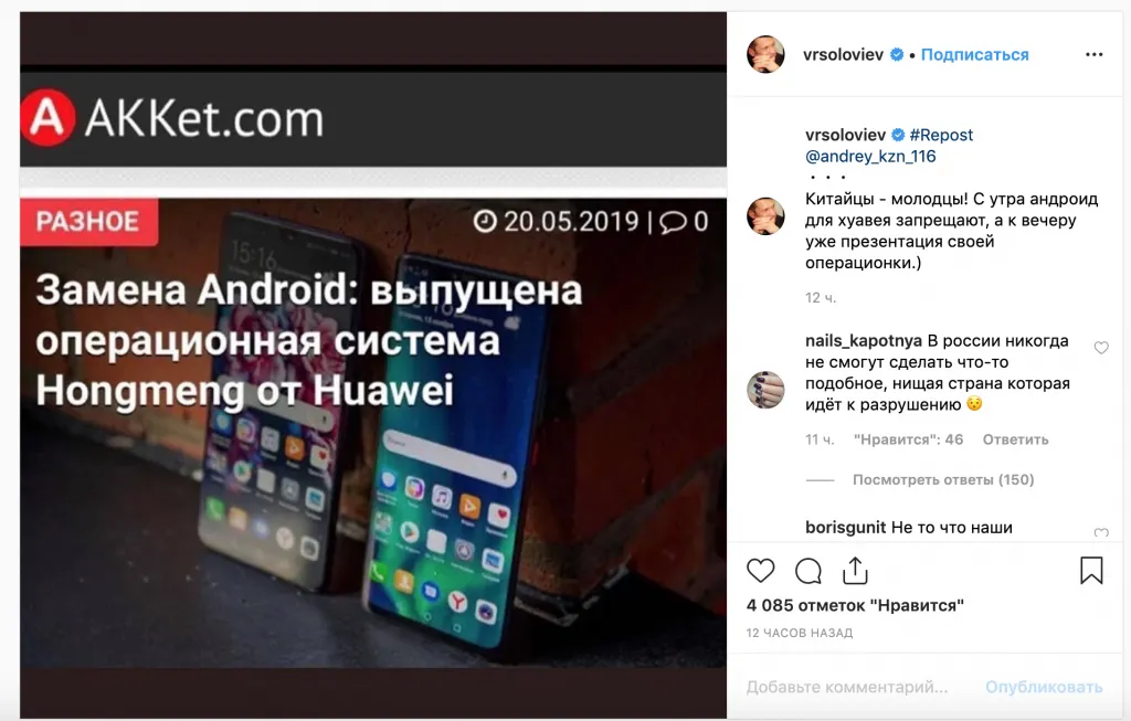 Это не помешало Владимиру Рудольфовичу выдернуть заголовок и похвалить китайцев с презентацией альтернативной операционки. Перепост из Instagram Соловьев кинул в Twitter, где его читают 1,4 млн человек.