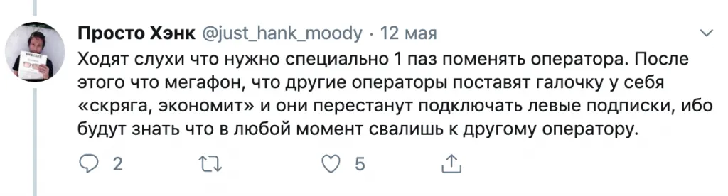 Я абонент «Меги» с 2012 года – то есть лояльный. Сейчас, после разговора с сотрудником поддержки, вспомнил, что в сентябре 2018 года мне звонили из офиса с предложением оптимизировать тариф «чтобы платить меньше». Своим соглашением я де-юре позволил ушлому коммивояжеру, говорившему от имени «Мегафона», привязать к моему тарифу якобы важную услугу. Странно, что она была подключена только 2 марта, а не сразу.