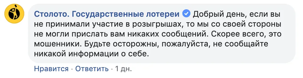 Разумеется, ни в какой лотерее Алексеева не участвовала – она сразу написала в «Сбер», где ей предложили заблокировать карту. В «Столото» заявили, что будут разбираться с инцидентом и заметили, что со своей стороны не могли прислать ей никаких сообщений.